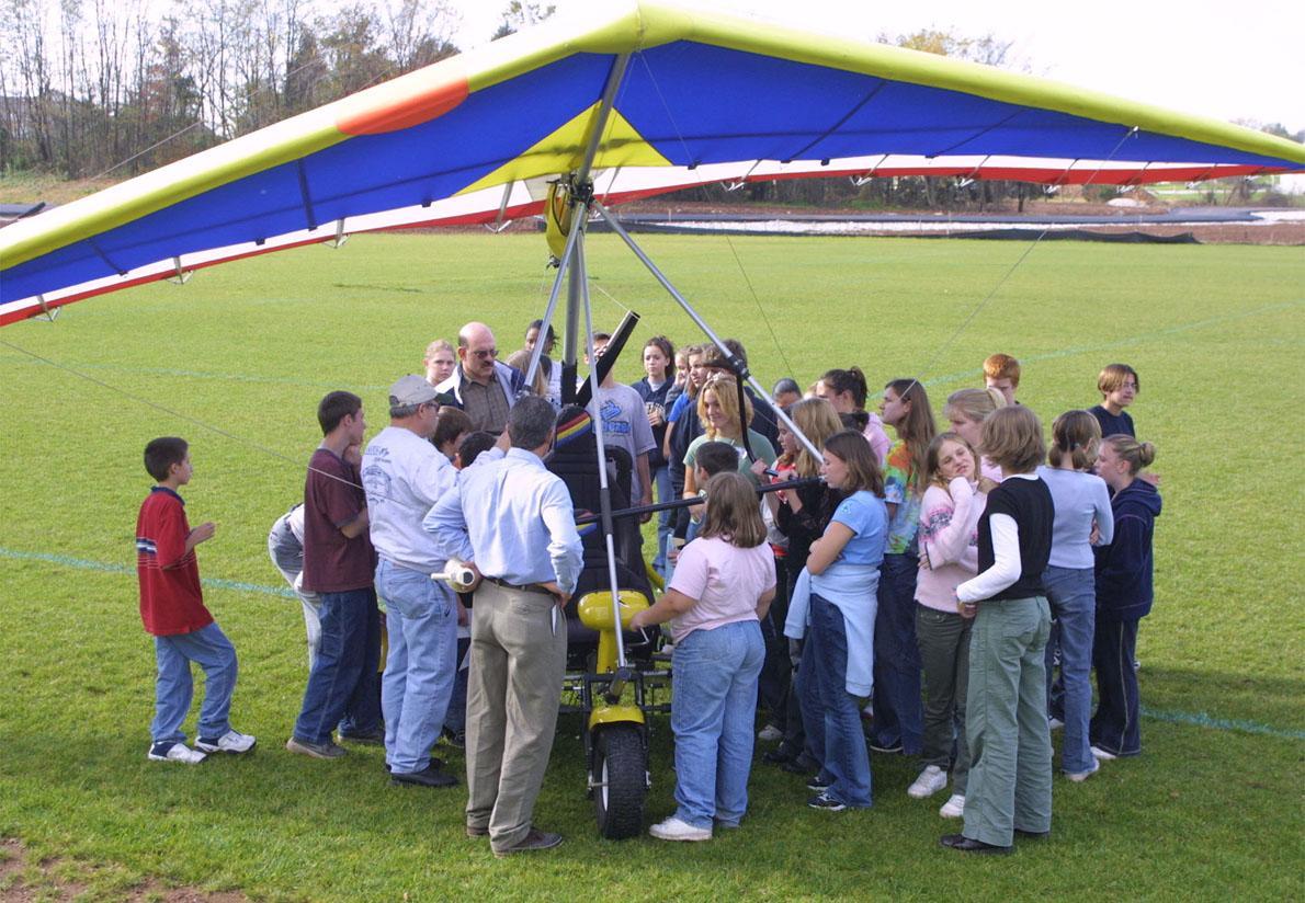Most of the students showed a genuine interest in Gary and his trike - not the usual group who just show up so they can get out of class. "What surprised me most was the quality of the questions from all the students," Gary said. "Their questions were mostly about cost, speed, fun, storage, safety, and a comparison to general [aviation] aircraft. Of the topics discussed, I felt safety was their highest priority. Kids are funny, where most adults avoid such a question; they simply ask, 'Did you ever crash?' I think they appreciated that I answered 'Yes' and described in detail a mishap I had and what caused it." Gary discussed the importance of good flight instruction. He also told them that most modern ultralights are safer than the earlier models.
